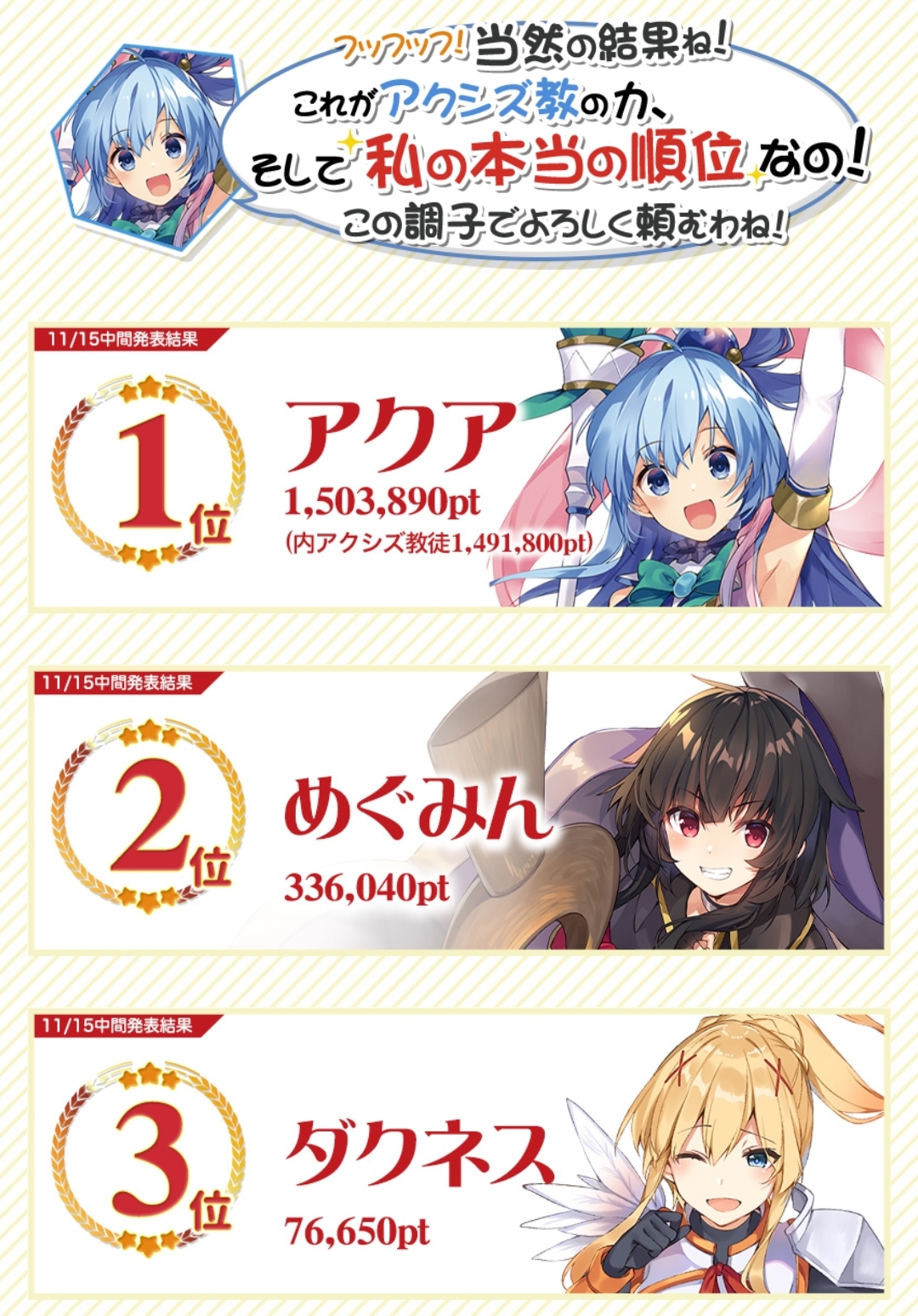 めぐみん>>リーン>アクア>クリス